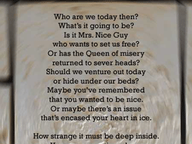 Write a letter to the personality trait you like least, convincing it to shape up or ship out. Be as threatening, theatrical, or thoroughly charming as is necessary to get the job done. Photographers, artists, poets: show us UGLY. The Wall! Ugly Love? For some people love is beyond their comprehension, however much they try. The problem is they only want to love in order … Continue reading Shape Up or Ship Out: Who Are We Today Then?
